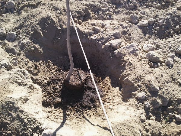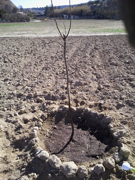 Coloco el cepellón del árbol encima de la mezcla anterior para que las raíces se peguen bien al sustrato y dispongan de humedad.Coloco una caña como referencia para que el hoyo una vez plantado el árbol quede a menos profundidad que el resto del terreno y se pueda almacenar el agua al regarlo.