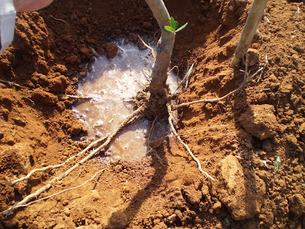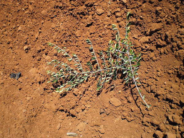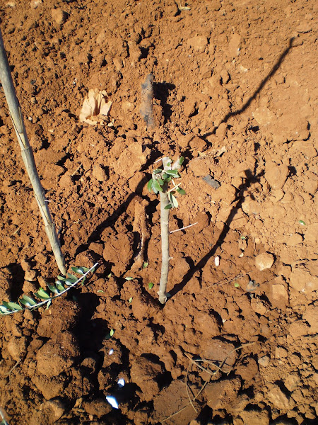Hace dos años hicimos estacas o esquejes a partir de olivos madre y los plantamos en tierra, todos en una hilera para "criarlos". Los hemos estado regando de forma periódica hasta que han enraízado y están listos para ser plantados en su lugar definitivo.