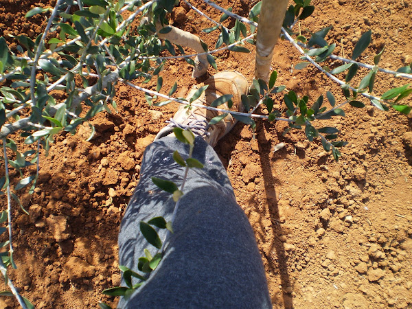 Hacemos el hoyo, echamos medio cubo de agua dentro del hoyo y colocamos el olivo, a continuación tapamos con tierra el agujero y con ayuda de los pies compactamos la tierra alrededor del tronco del olivo para eliminar posibles bolsas de aire, quede bien apretada la tierra y el olivo queda bien sujeto y firme.