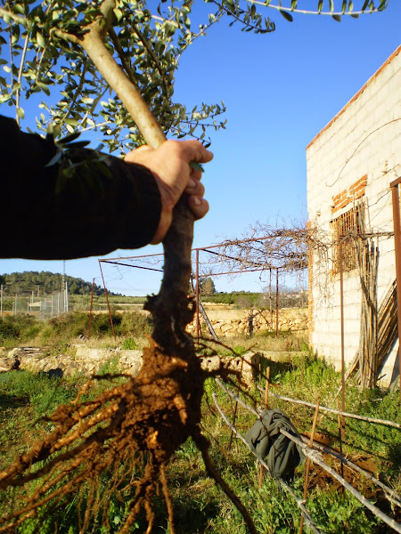 Se trata de ir descubriendo la tierra alrededor de los olivos para poder sacarlos con facilidad, e intentando hacer el menor daño posible a sus raíces. Para ello regamos la tierra el día anterior. De esta manera conseguimos que el suelo quede más tierno y más suelto a la hora de arrancar los olivos. Las raíces salen con más facilidad.