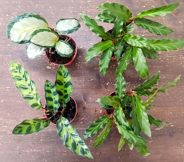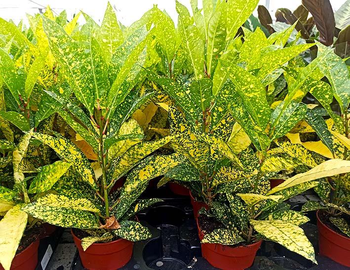 Calathea: Esta herbácea es originaria de los bosques tropicales de Sudamérica. Prefiere los sitios luminosos, cálidos y húmedos. Es necesario pulverizarla con frecuencia para mantenerla constantemente húmeda y regar poco en invierno.Croton: Arbusto que proviene de los bosques tropicales de Indonesia. Prefiere un lugar luminoso evitando el sol directo, con calor y humedad. No tolera bien las corrientes de aire y el frío. Hay que mantener su sustrato y hojas húmedas y, en invierno, reducir la frecuencia de riego.
