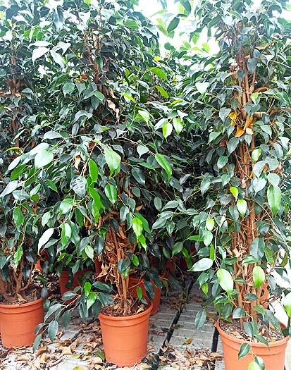 Ficus: Es un árbol que procede del sudeste asiático que necesita un emplazamiento luminoso y cálido. El riego debe ser abundante en verano y escaso en invierno. Tiene la particularidad de que los cambios bruscos de temperatura, humedad y corrientes de aire, le provoquen una excesiva caída de hojas.