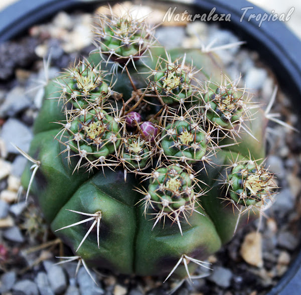 Cactus del género Gymnocalycium con numerosas plantas hijas en su superficie