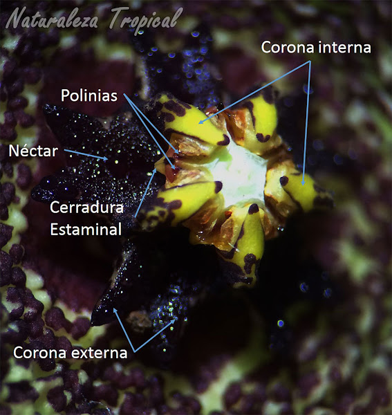 En el centro de la flor se observa una estructura pentagonal en cuyos laterales se disponen las polinias(siempre en pares) y seguidamente unos surcos verticales (uno por lado) conocidos como raíles de polinización o cerradura estaminal. Debajo de la cerradura estaminal existe una cavidaden la que se formará el néctar.
