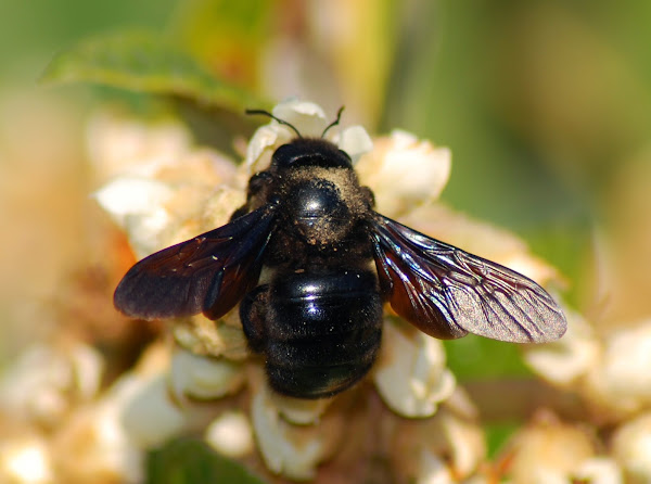 Otro tipo de abeja, menos abundante y de conducta solitaria, es la abeja azul de la madera (Xylocopa violacea). Grande, zumbona, impresionante, se abre paso a la fuerza entre los pétalos para acceder al festín. Lleva el dorso cubierto de polen.