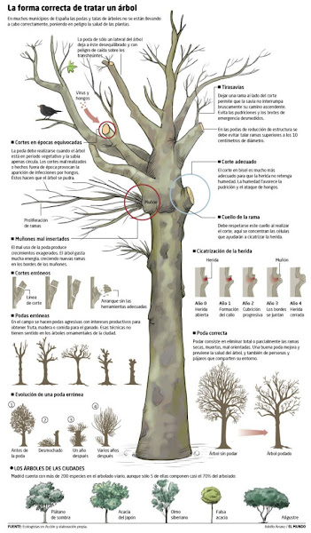 «Pues porque no nos queda otra», explica Labajos, ya que muchas de las especies que crecen en las ciudades no fueron en su día bien elegidas. Son demasiado grandes para la calle estrecha en la que están, o los árboles fueron plantados tan juntos o sobre un terreno tan poco apropiado que se salen del espacio o crecen torcidos o apuntando sus ramas hacia los viandantes o los coches. «Las podas son un parche a un problema que se ha generado en el momento de la plantación porque no ha habido una planificación».«Es la pescadilla que se muerde la cola», dice Enrique Paredes, presidente de la Escuela de Paisajismo y Jardinería Castillo de Batres.