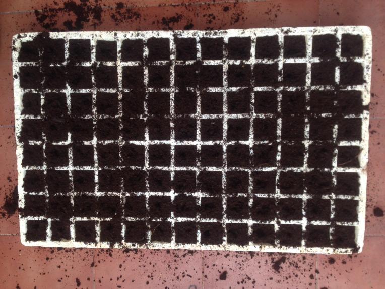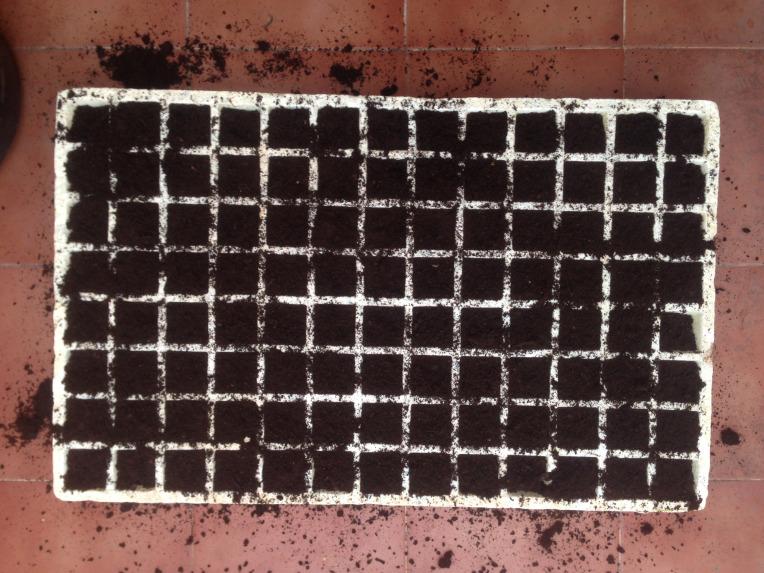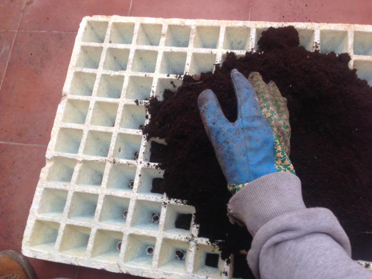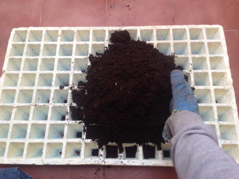 Una vez hayamos mezclado el sustrato y los posos, y conseguido una mezcla homogénea nos dispondremos a rellenar los alveolos vaciando una cantidad considerable de la mezcla encima de la bandeja, y extendiéndola con las manos intentando llenar los alveolos completamente pero sin presionar el sustrato dentro de ellos.