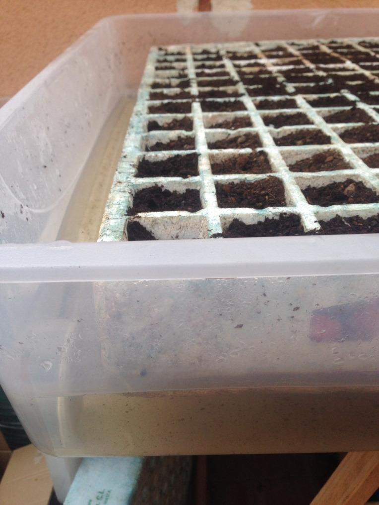 Regamos introduciendo la bandeja de alveolos en bandejas de plástico, que elegimos con medidas aproximadas pero con algo de holgura.