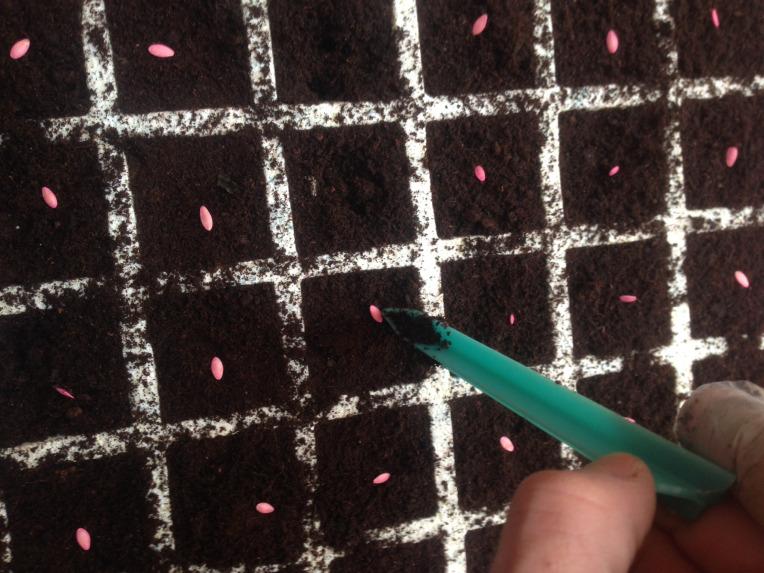 Introducimos el punzón de plástico suavemente en el lateral de la semilla creando un agujero debajo de la misma, de manera que la semilla cae sola en ese hueco y al retirar el punzón la tierra vuelve a caer y tapar la semilla. No es lo normal, pero debemos asegurarnos de que al sacar el punzón la semilla no ha quedado agarrada al mismo. No debería pues la mezcla del sustrato debería estar seca, pero la humedad del ambiente es otro factor que puede fallarnos.