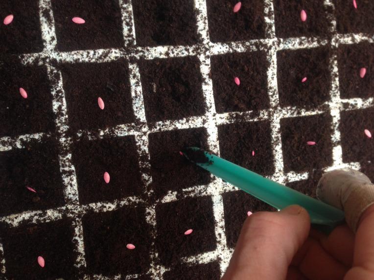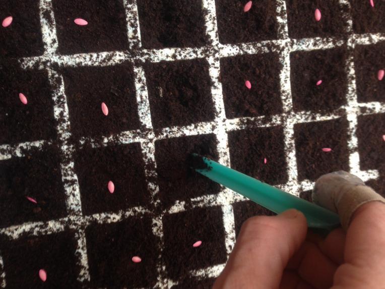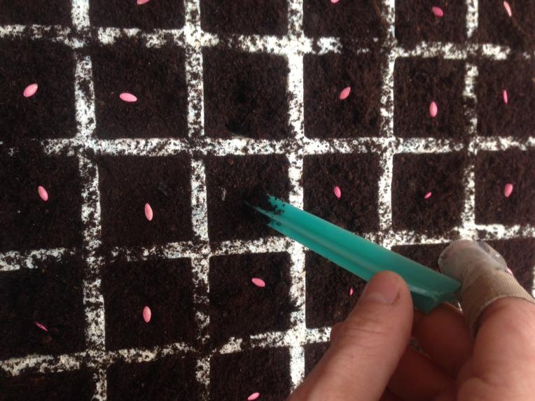 Para hundir ligeramente las semillas, nosotros usamos una especie de punzón de plástico, aunque podéis usar cualquier objeto delgado con el que no dañéis la semilla o incluso vuestro propio dedo.