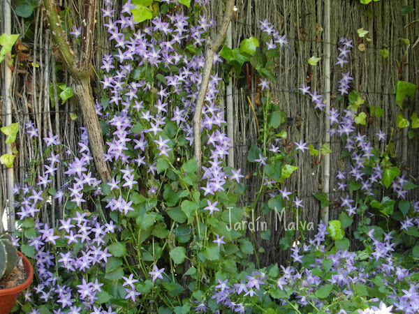 En mi jardín incluso crece apoyándose en el cañizo y sube bastante por la pared, haciendo honor a su sobrenombre, Campanilla de los muros. Cuando florece, el efecto es precioso. También es perfecta para macentas pues crecerá colgando, formando una cascada.