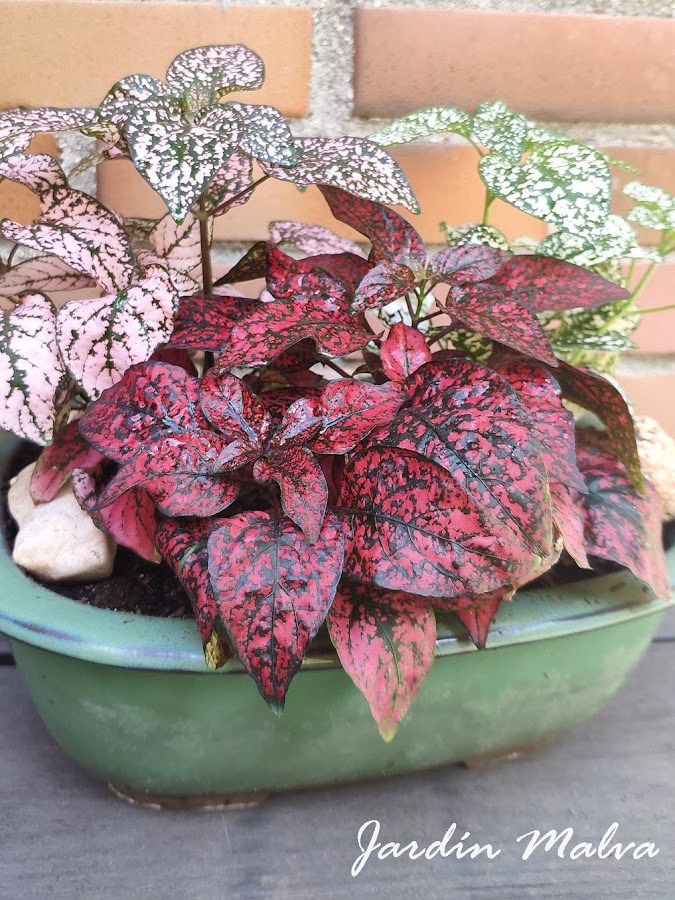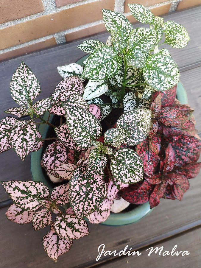 Me encantan los colores de las Hipoestes, con sus hojas verdes salpicadas. Estas manchas pueden ser rojas, rosas, blancas.... Yo he combinado tres diferentes en este centro pero no podría decidirme por ninguna de ellas.