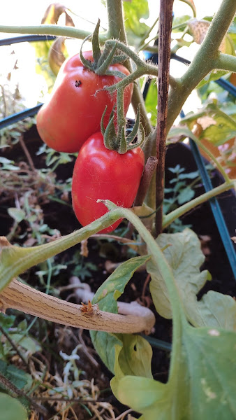Otra novedad este año, este verano, ha sido una tomatera espontánea que a pesar de darme muchos frutos, no han cuajado bien. Sólo salvé los dos primeros, que por cierto yo creía que eran pimientos, por su forma e interior... pero no, eran tomates pera o un primo.