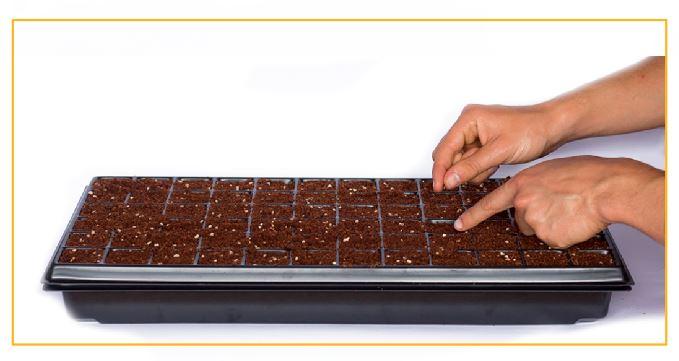 5- Introduzca una semilla en cada una de las cavidades o alveolos de la bandeja germinadora, presionándola ligeramente y cúbrala con un poco de sustrato.