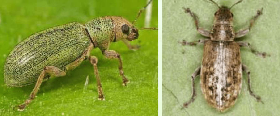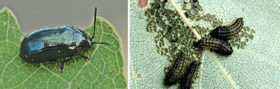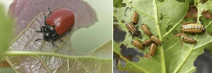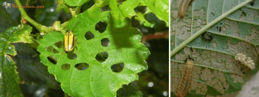 Los escarabajos dañan las hojas tanto en estado de larva como adulto.