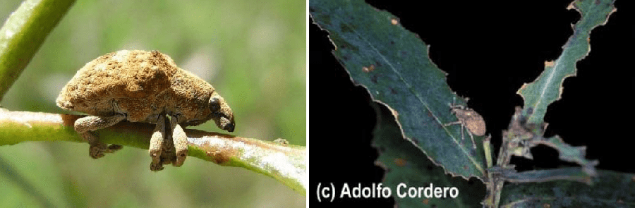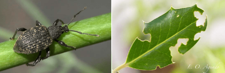 Pequeños gorgojos de tonos plateado-rosados que roen las acículas de los pinos (Pinus sp.), especialmente el Pino carrasco (P. halepensis).