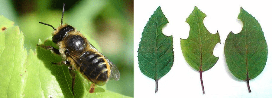 Abeja cortadora de hojas, que no se alimenta de ellas, pero las utiliza para la fabricación de sus nidos. Sus daños no son graves pero tienen perjuicio estético.