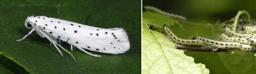 Plaga come hojas que teje sedas en numerosas especies como prunus sp., Espinos (Crataegus sp.), Sauces y mimbreras (Salix sp.) y Euonymus sp.
