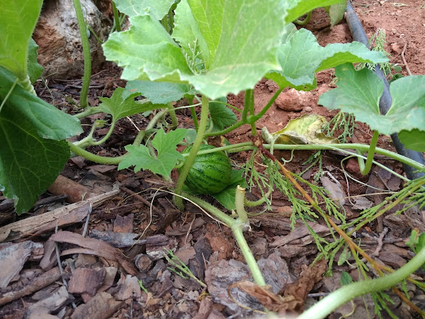 Nosotros no teníamos previsto plantar melones en el Huerto pero las plántulas brotaron de manera espontanea. Las semillas venían junto al compost que echamos para enriquecer la tierra del Huerto.Al disponer el resto de verduras sujetas con cañas para que crezcan verticales decidimos dejar las matas de melón de forma rastrera y ver como van desarrollando compartiendo sitio en el Huerto.