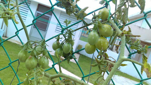 Tengo una planta de cherry tomatoes. Esta la tengo bajo techo en el balcón, solo coge sol por la mañana y por la tarde.
