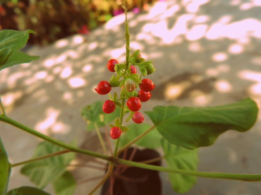 Fruto carnoso, globoso, liso, anaranjado a rojo brillante en la madurez, acompañado por los tépalos y los filamentos de los estambres persistentes y curvados hacia atrás, con una sola semilla por fruto. Semilla en forma de lenteja, de color café oscuro, generalmente cubierta de diminutos pelos espinescentes, a veces conserva pegada una capa del fruto y entonces su superficie se ve reticulada.