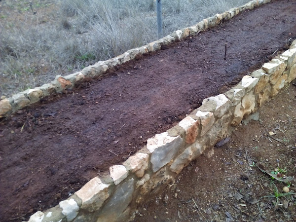 Para sembrar las semillas de la acelga hemos escogido un pequeño bancal elevado que tenemos a un costado de la parcela. Aprovechando las hileras de bloques levantados para colocar los postes y la malla metálica, hemos levantado, a 1 metro de distancia aproximadamente, un murete de mampostería para poder contener la tierra del bancal.