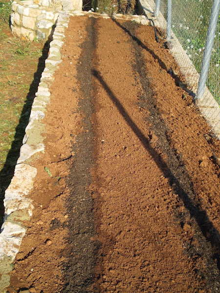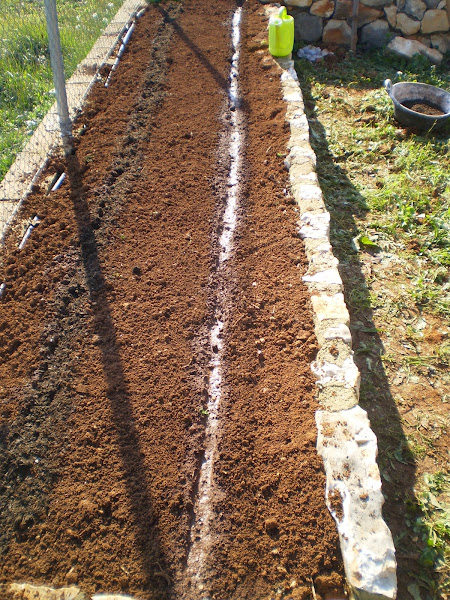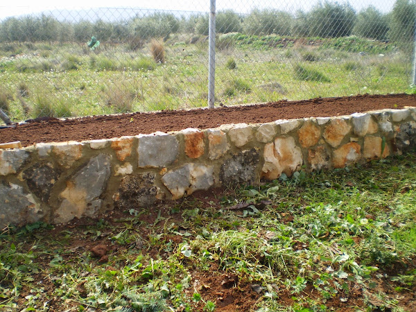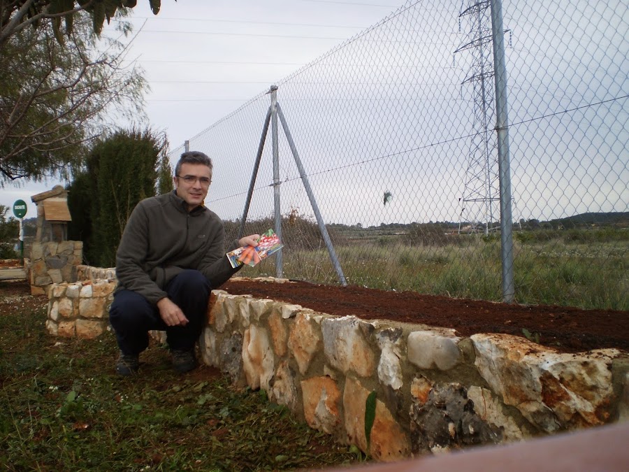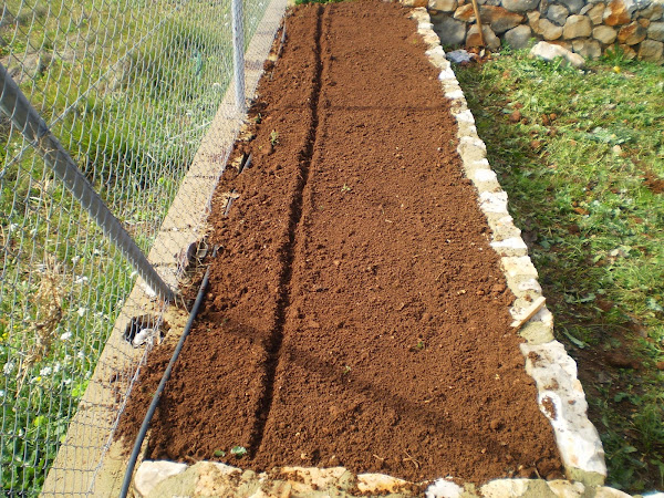 Para la siembra hemos habilitado un pequeño bancal o jardinera de piedra, el cual ya habíamos rellenado con tierra del huerto. Tiene alrededor de 4.5 metros de largo por unos 80 cm de ancho. Este tipo de bancales, al igual que los cerámicos, son más cómodos a la hora de cultivar, por su tamaño, porque están más elevados sobre el nivel del suelo y además son más limpios al no tener que pisar el terreno de tierra y barro una vez regados.