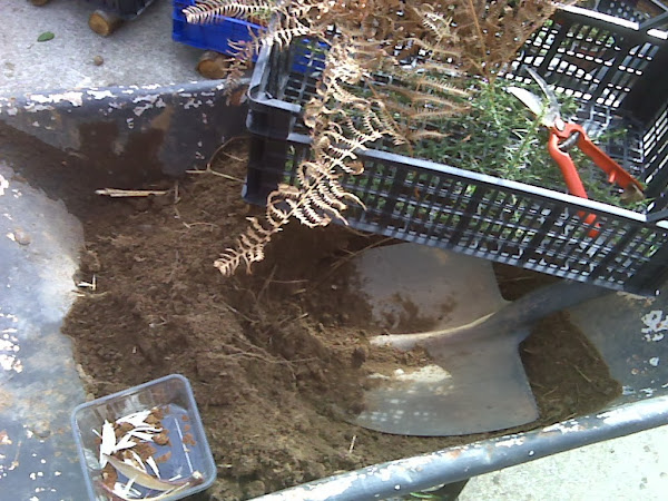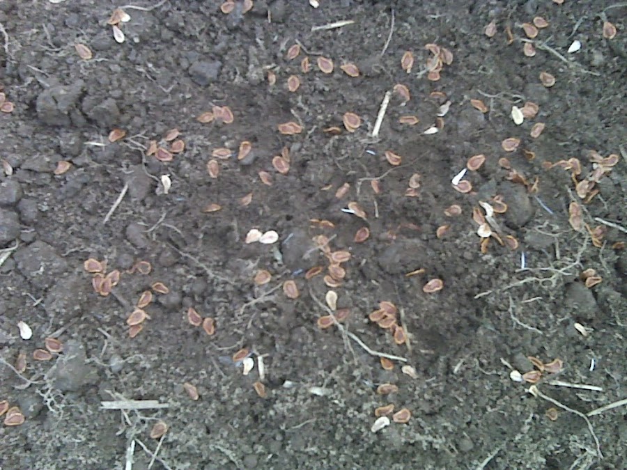 sembré una vaina completa de Orbea, tapé las semillas espolvoreando por encima un poco de tierra y cubrí la superficie con helecho seco para ahuyentar a las mariposas y espinos para mantener a raya a los gatos (que son muy aficionados a investigar los semilleros)