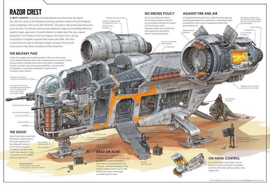 La cresta de la maquinilla de afeitar era una nave de combate utilizada por el cazarrecompensas mandaloriano Din Djarin . Alguna vez fue una nave militar utilizada para patrullar territorios locales antes del Imperio Galáctico . Djarin utilizó el barco como su medio de transporte y vivienda mientras cazaba fugitivos en los Territorios del Borde Exterior .
