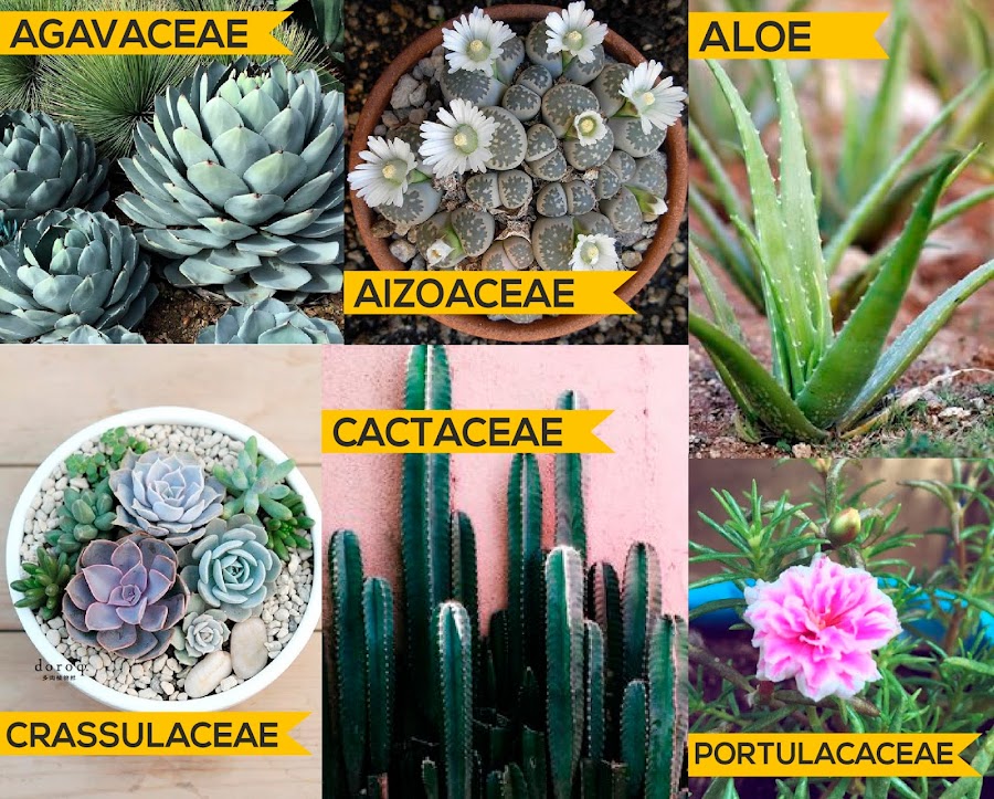 Hay miles de especies de plantas suculentas, que a su vez, están divididas en familias. Para explicarles mejor hice esta imagen con fotografías de Pinterest donde aparecen las más comunes.