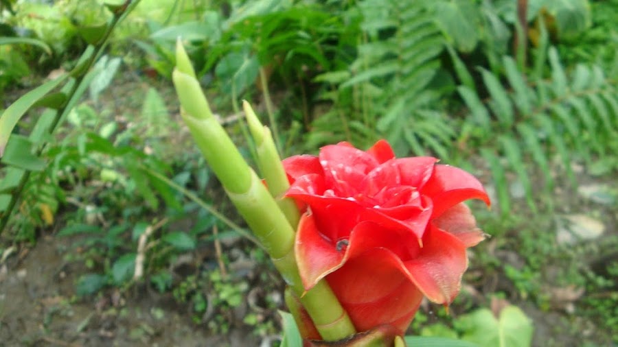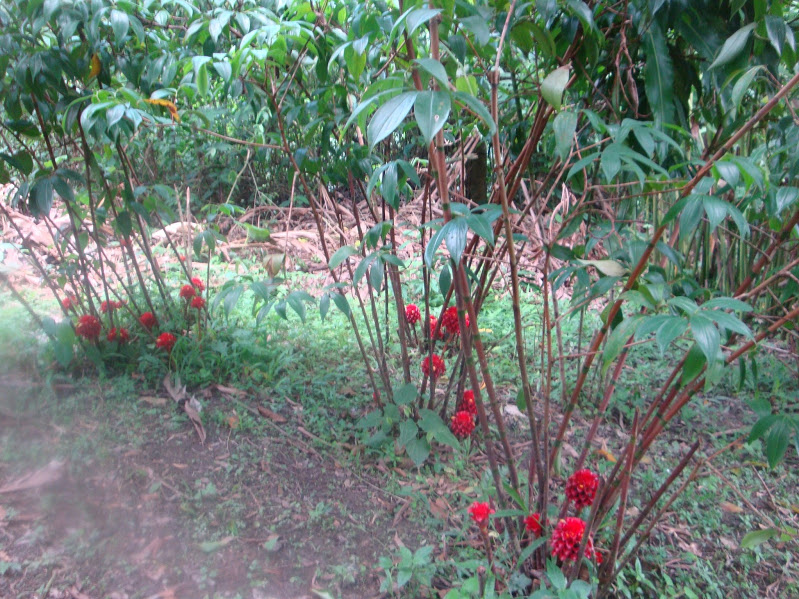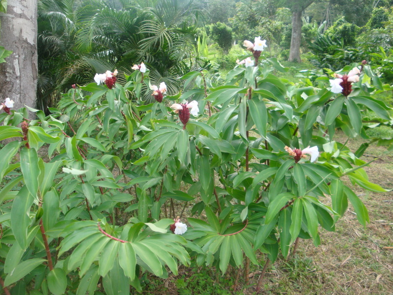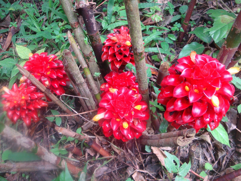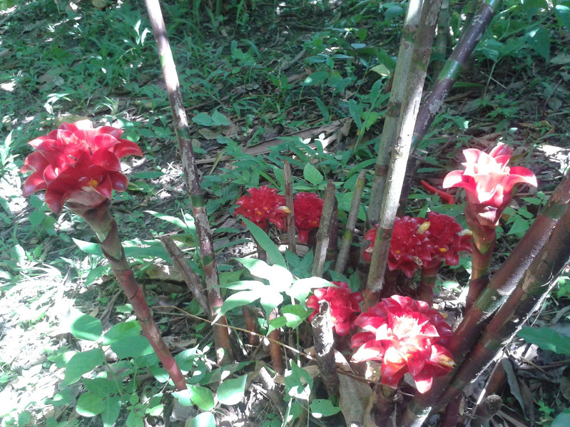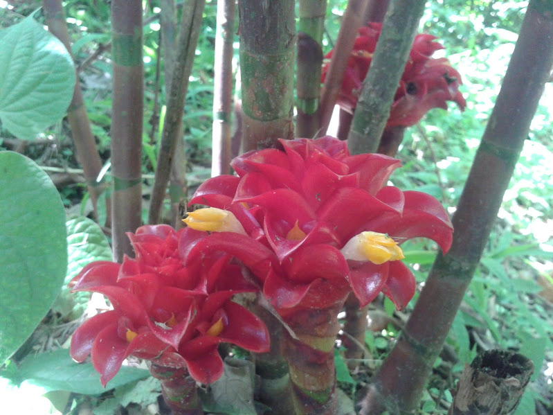 Aquí vemos un costus speciosus, donde podemos ver que el follaje es similar pero las brácteas con las flores están en las puntas de las hojas..