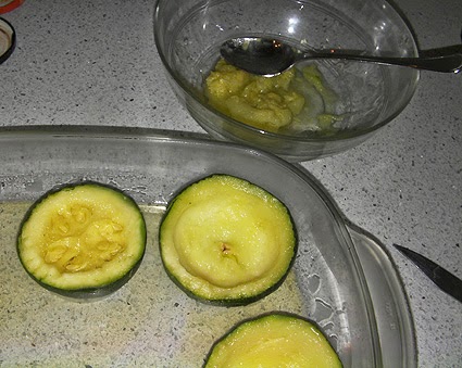 Quitando la pulpa a los calabacines y ubicándolos en la fuente para horno.