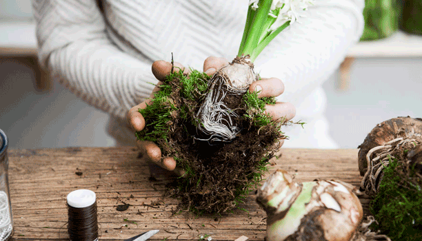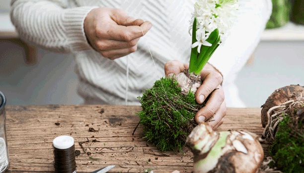 Utiliza la técnica japonesa del kokedama, que ya sabéis que consiste en cultivar ciertas plantas dentro de bolas hechas con musgo, prescindiendo de los tiestos habituales.