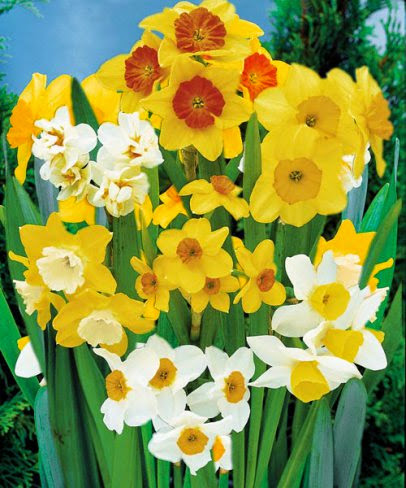 Los Tulipanes y Narcisos empiezan un poco más tarde, cuando empieza caldearse el ambiente. Un truco para prolongar su floración más bien corta y efímera, es ir plantando los bulbos desde octubre hasta diciembre, cada semana unos pocos, así no florecen de una vez todos y parece que duran más. Como mejor se ven es en grupos. Encienden con los rojos intensos, rosas y fucsias llamativos, amarillos y blancos desprendiendo destellos de luz. Los Narcisos abriendo sus graciosas trompetas, de flores sencillas, de flores dobles, de tonos de lo más luminiscentes y alegres.