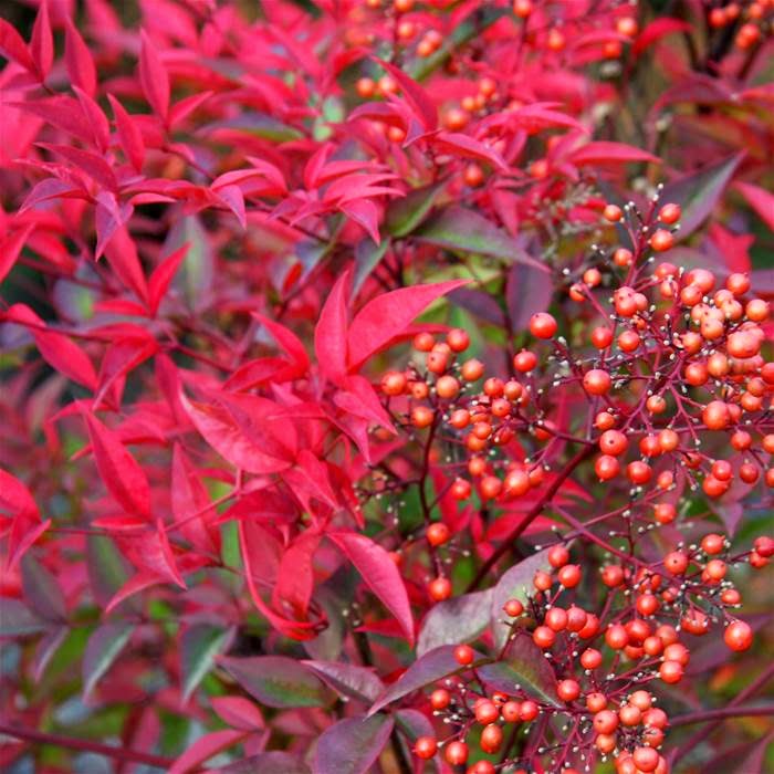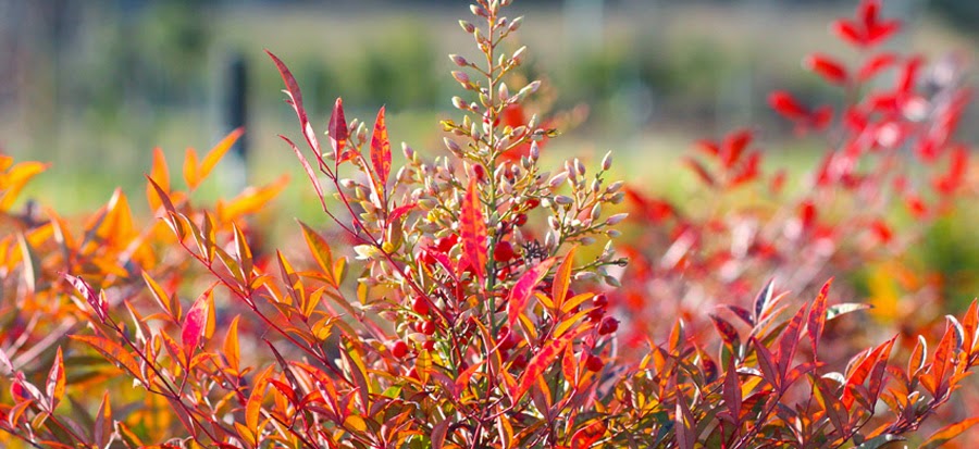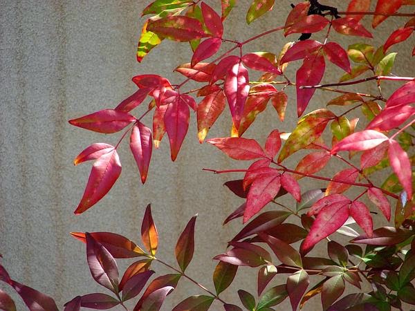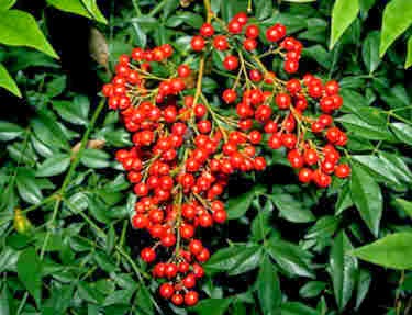 Desde otoño hasta la primavera echan esos racimos tan cargados de fruto, que por cierto es toxico, para tenerlo en cuenta allí donde hay niños .Combinan bien con cualquier planta, pero a mi me ha gustado mucho la de los helechos. Como no requiere sol de la tarde, puede estar a la sombra tranquilamente, con los helechos debajo que va de mil maravillas...pero claro que cada uno puede ponerla done, como, y con que planta , o sin más la Nandina sola, que lucen igual.