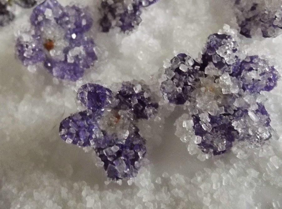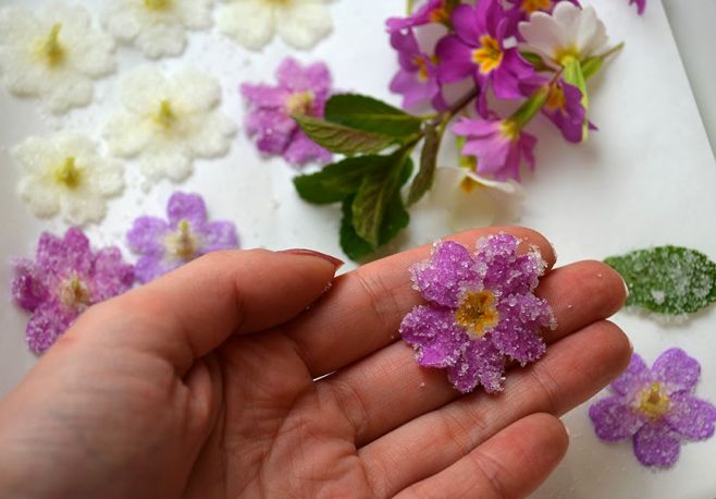 Mi madre cuando quería ataviar una tarta con unas flores de Pensamientos, lo primero que hacía es mojarlos bien en la clara de los huevos batida, para que se pongan un poco pegajosos y luego espolvoreaba todo con azúcar y lo dejaba secar. Quedaban unas decoraciones fabulosas y muy elegantes para tartas. Y exactamente igúal con las florecillas de Violeta Africana, Capuchinas..