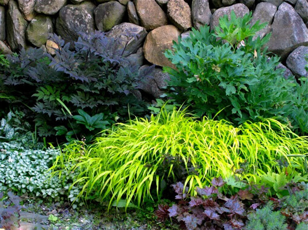 césped, de entre hiedras tapizadas, entre algúnas gramineas.... Hacen una tarta de tonos y formas en vuestro patio.