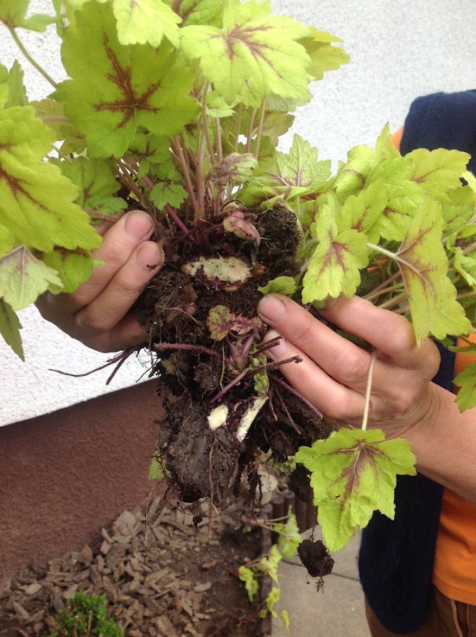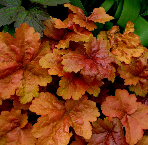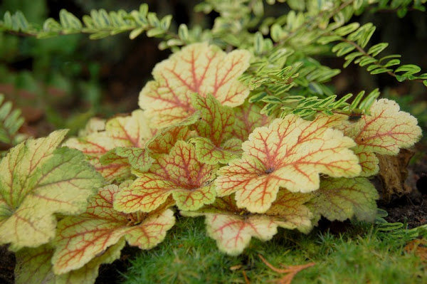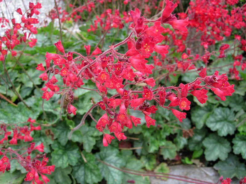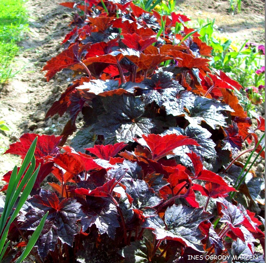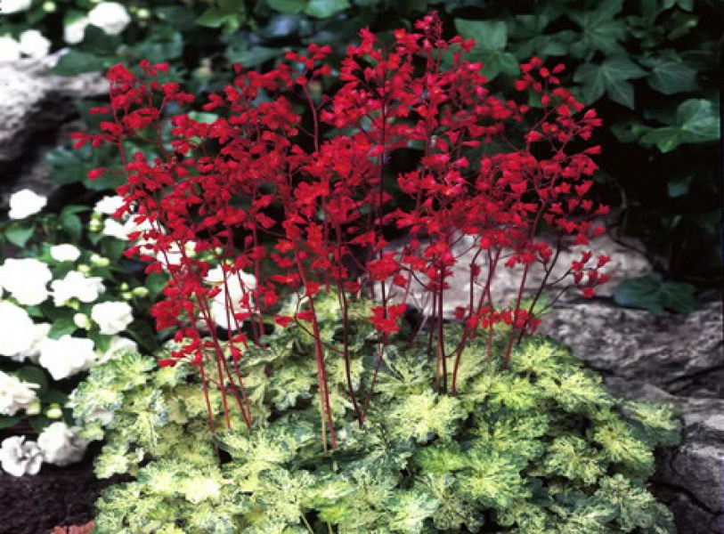 como un ramo de entre las hiedras bicolor tapizantes. Queda muy alegre. Da una especie de iluminación mágica al atardecer. Cuando el invierno estropea la mayoría de las plantas y se secan o desaparece la parte aerea, la Heuchera no cambia en absoluto su aspecto.En lugares fríos y con heladas fuertes y largas, la verdad que se pone algo fea. Pero con algúna que otra escarcha suave presenta un aspecto de lo más singular.