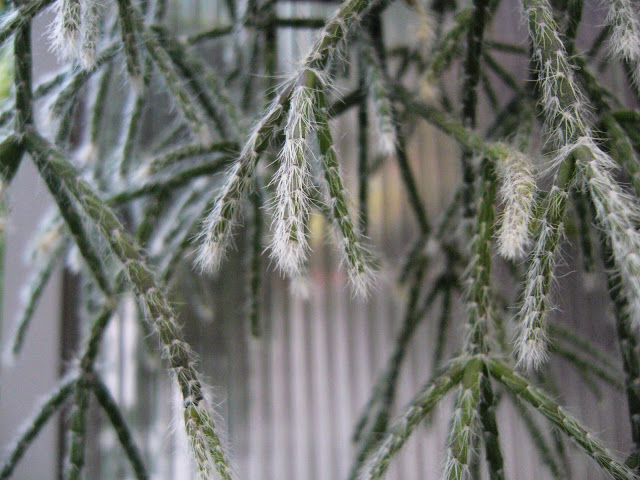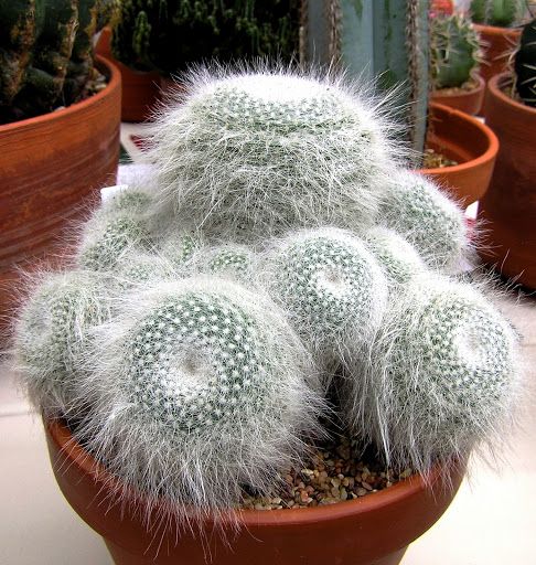 Variedades de Mammillaria (cactus) suelen tener un "pelaje" rebosante. Incluso si los tocas no llegan a pinchar (y eso que tienen unos pinchos fuertes y grandes) de la cantidad de pelo que cubre toda la planta. De la variedad Rhypsalis, algunos están recubiertos por finos pelillos/pinchos, que no hacen daño, pero a ellos les sirven de protección.