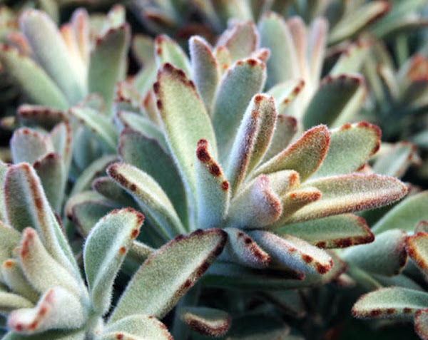 Múltiples variedades de Kalanchoes poseen esa especie de "abriguitos peluditos". Realmente lo más decorativo que tienen es precisamente la hoja, aunque echan una larga vara con florecilla, que yo suelo quitar, para que no quite energía a las hojas. Así pueden seguir creciendo y echando más hojas.