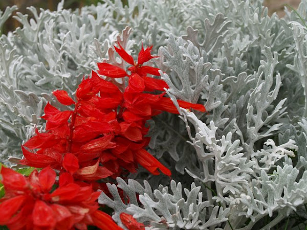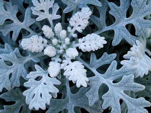 Otra de mis favoritas es la Cineraria Marítima. Un tono entre gris y plateado, como blanco nevado. La forma preciosas de las hojas combina genial con cualquier tipo de flores en el jardín o balcón. Mi Mamá sentía una debilidad especial por combinarlos con una Salvia roja brillante. Así destaca más el color de la Salvia y así mismo se ven mejor las formas bellas de la Cineraria.