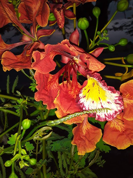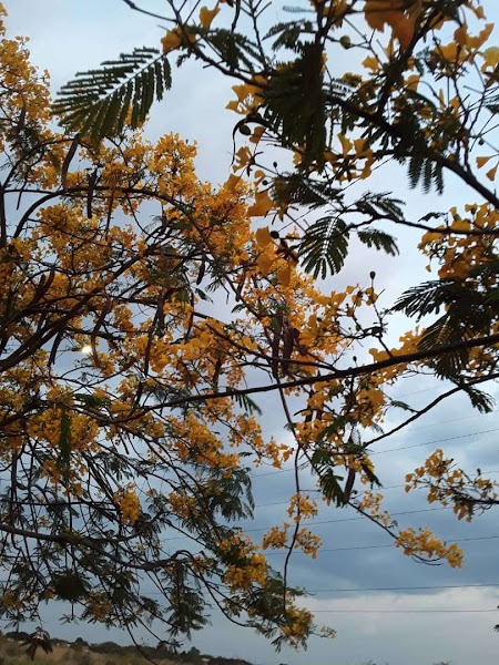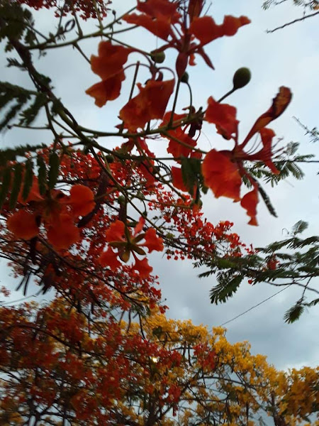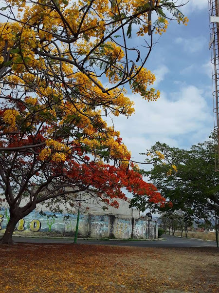 Este fabuloso árbol, generalmente de color rojo, lo tenemos aquí en color amarillo y anaranjado, Ubicados en Paraparal, una zona popular del Municipio Los Guayos, Estado Carabobo, Venezuela. Estas fotos me las hizo Ana T.