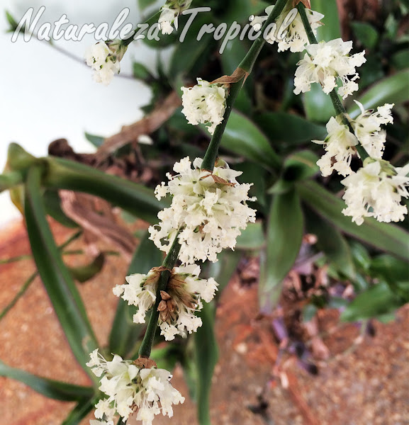 Las flores son muy pequeñas y no poseen un gran valor estético debido a que las plantas se deforman cuando emiten el tallo que sostendrá a las flores. Esta elongación se produce en el ápice de los tallos (los tallos crecen casi el doble de su talla original pero no logran mantenerse erectos) donde se desarrollarán pequeñas hojas e inflorescencias en panículas poco llamativas que contienen numerosas flores pequeñas. Las flores miden +/- 1 cm de diámetro, las estructuras reproductoras masculinas (estambres, filamentos y anteras) sobresalientes y presentan 3 pétalos de color blanco.