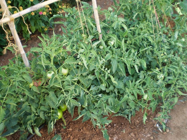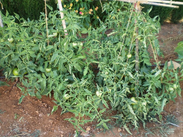 Aprovechando este pequeño cambio en la plantación, decidimos no podarlas desde el principio, de ahí su aspecto asilvestrado, y la verdad es que no fueron nada mal, resistieron muy bien, los tomates tenían un tamaño aceptable y produjeron una buena cantidad de ellos.