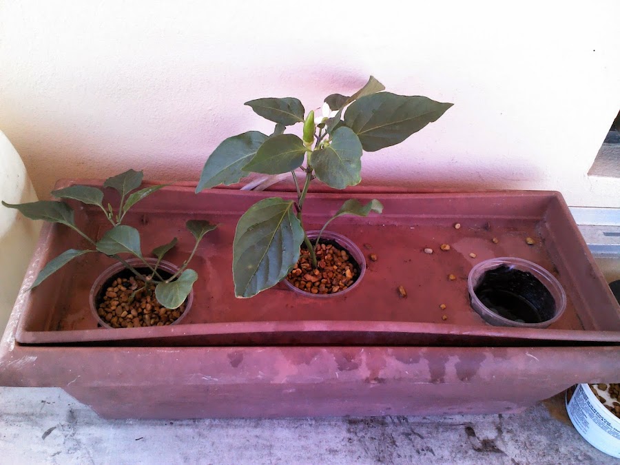 En esta hidroponia que es muy simple de hacer puse las plantitas de pimiento picante de Chile que ya estaban bastante grandes con muchas raíces. Una de ellas ya tenia un pimiento y flores. La otra todavía no tenia nada. Veremos como sigue el crecimiento y les estaré informando.