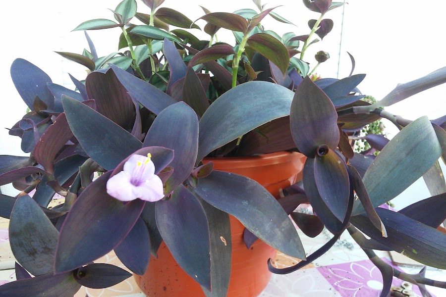 Subo foto de una maceta grande que tengo llena de trandescantias, aunque hace frío y ha granizado, siguen floreciendo!