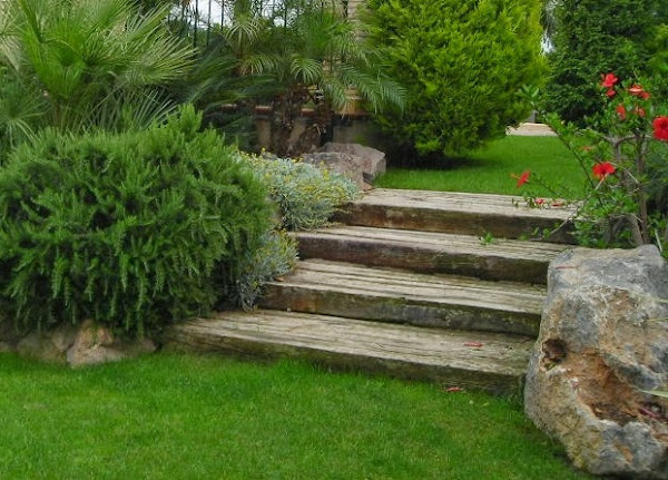 15. En los desniveles pon escaleras, ya que tapizarlas con vivaces sería una solución aunque estas consumen mucha agua.