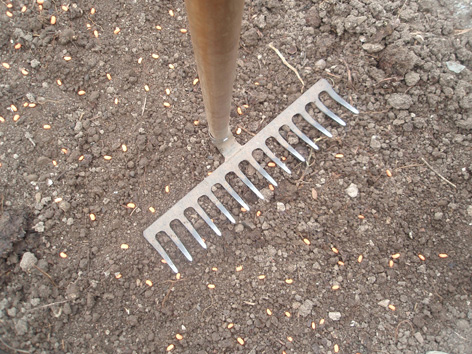 Apretamos un poco las semillas contra el terreno con el canto del rastrillo.