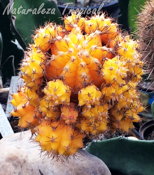 Cactus con numerosas plantas hijas, color naranja, Gymnocalicium mihanovichii