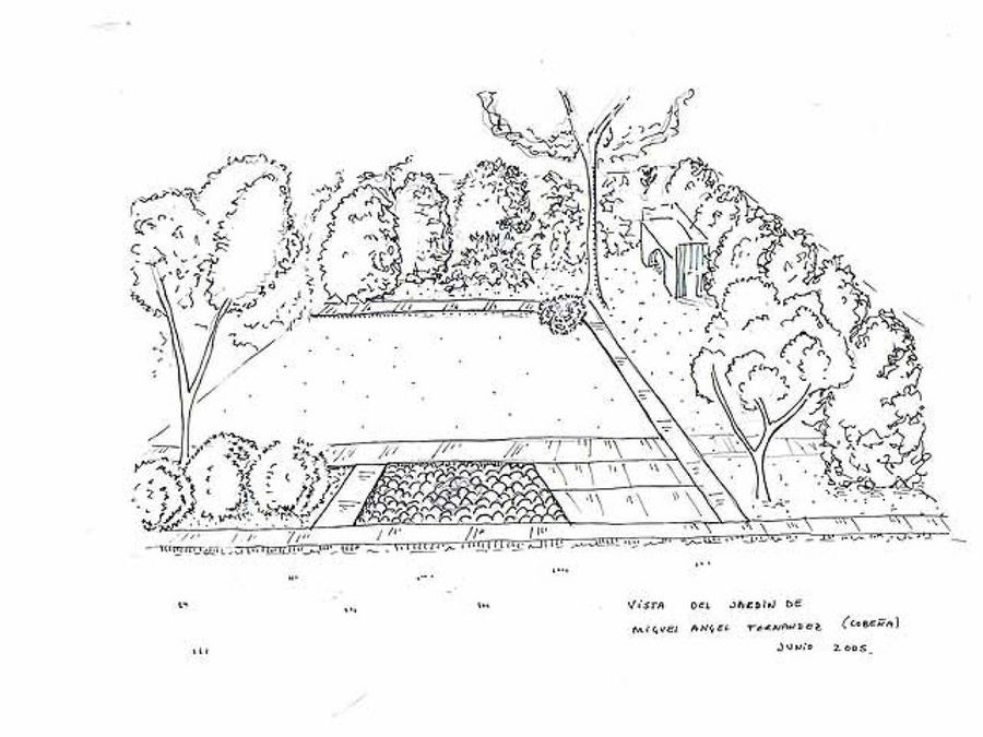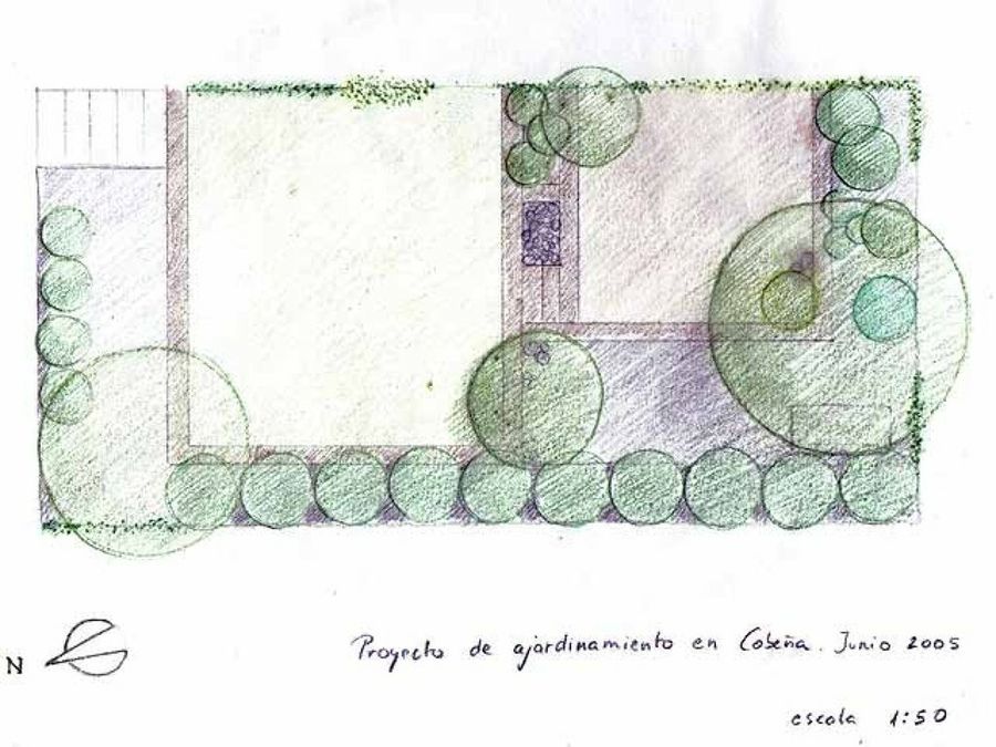 En los croquis, tanto de planta como alzado, podemos hacernos una idea del concepto y objetivos que se plantean a la hora de abordar este trabajo. Los espacios, al ser tan reducidos y urbanos, se organizan ortogonalmente, delimitando las zonas con traviesas de madera. El jardín se divide en dos zonas principales: césped y jabre.